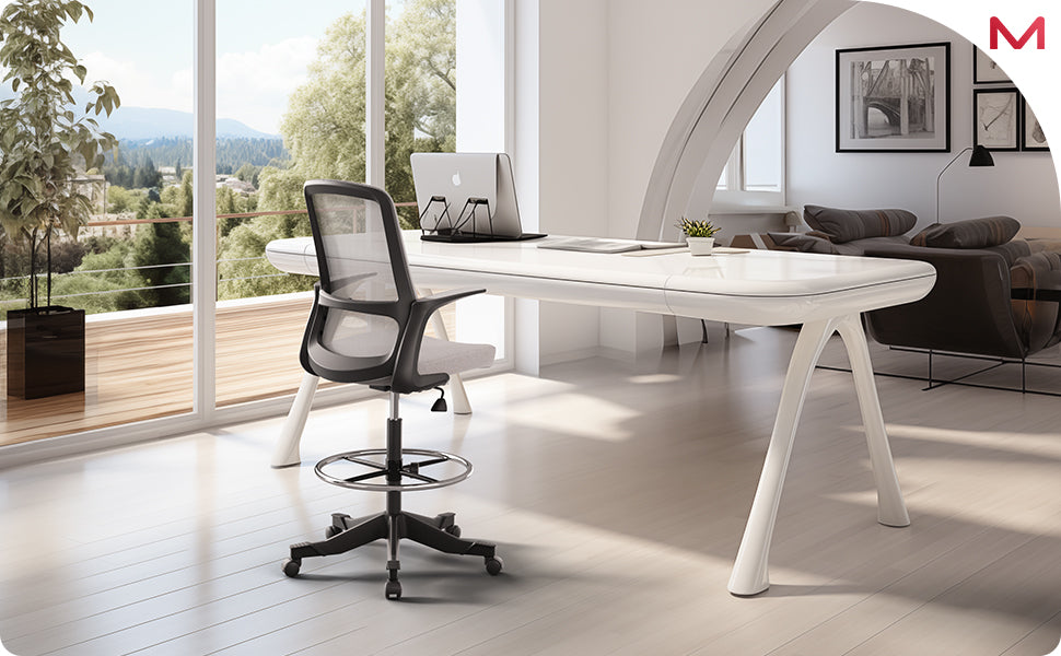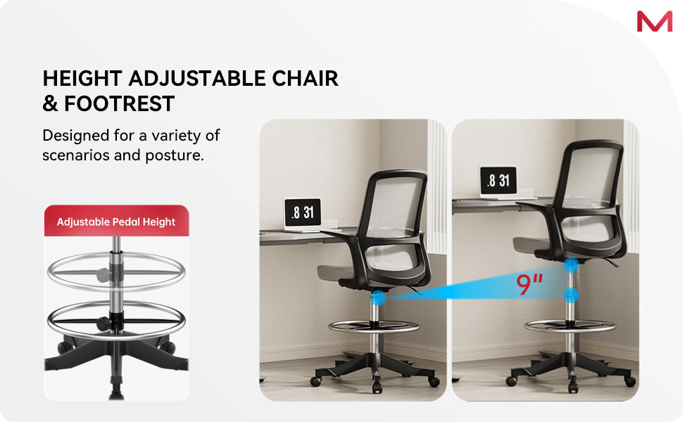This drafting chair features 4 support points, height adjustable foot ring, mesh back and wider sponge cushion.